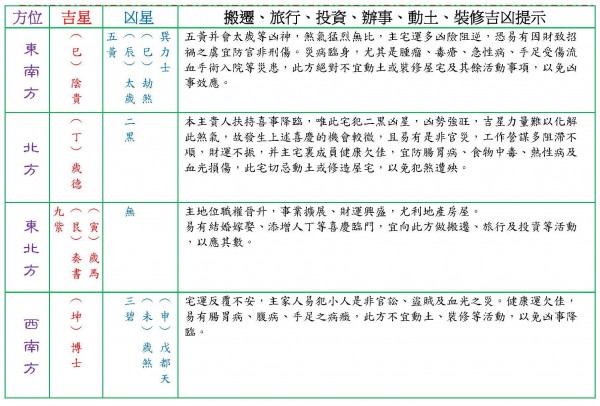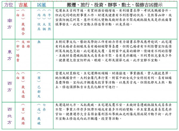 南方 (不宜在此方位動土、裝修等活動以免犯煞招惹凶星降臨,必遭禍殃。)